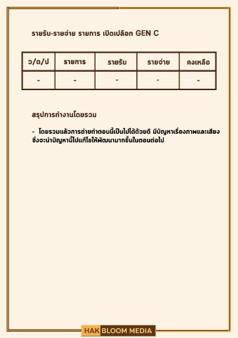 รายรับ-รายจาย รายการ เปดเปลือก GEN C สรุปการทำงานโดยรวม - โดยรวมแลวการถายทำตอนนี้เปนไปไดดวยดี มีปญหาเรื่องภาพและเสียง ซึ่งจะนำปญหานี้ไปแกไขใหพัฒนามากขึ้นในตอนตอไป