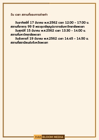 วันศุกรที่ 15 มีนาคม พ.ศ.2562 เวลา 13.30 – 14.00 น.