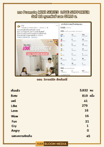 การ Promote MINI SERIES LOVE SUPPORTER วันที่ 12 กุมภาพันธ เวลา 07.16 น. ตอน. วิจารณรัก ฮักเต็มปรี่ 5,832 คน 819 ครั้ง 41 279 16 16 21 1 0 แสดงความคิดเห็น 45