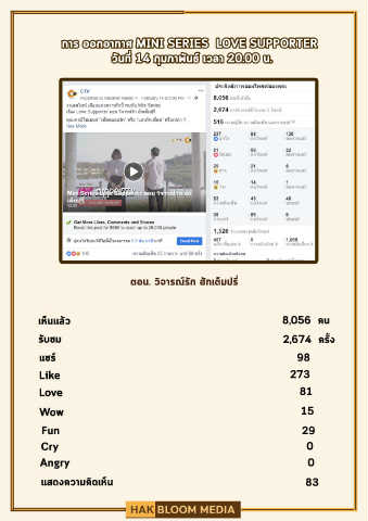 การ ออกอากาศ MINI SERIES LOVE SUPPORTER วันที่ 14 กุมภาพันธ เวลา 20.00 น. ตอน. วิจารณรัก ฮักเต็มปรี่ 8,056 คน 2,674 ครั้ง 98 273 81 15 29 0 0 แสดงความคิดเห็น 83