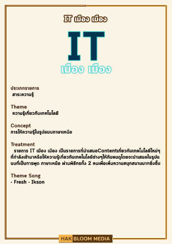 รายการ IT เมือง เมือง เปนรายการที่นำเสนอContentเกี่ยวกับเทคโนโลยีใหมๆ
