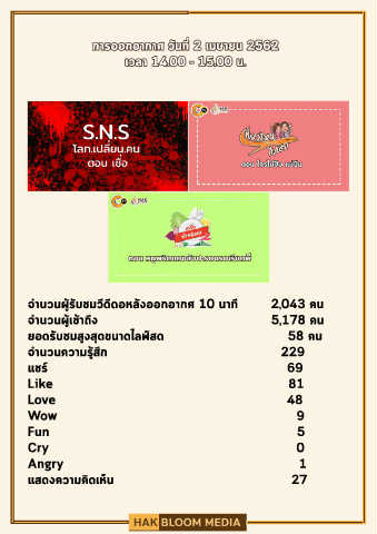 การออกอากาศ วันที่ 2 เมษายน 2562 เวลา 14.00 - 15.00 น. จำนวนผูรับชมวีดีดอหลังออกอากศ 10 นาที 2,043 คน จำนวนผูเขาถึง 5,178 คน ยอดรับชมสูงสุดขนาดไลฟสด 58 คน จำนวนความรูสึก 229 แชร 69 Like 81 Lo Lve 48 Wow 9 Fun 5 Cry 0 Angry 1 แสดงความคิดเห็น 27