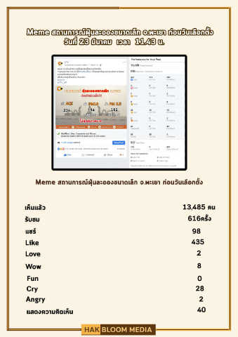 Meme สถานการณฝุนละอองขนาดเล็ก จ.พะเยา กอนวันเลือกตั้ง วันที่ 23 มีนาคม เวลา 11.43 น. Meme สถานการณฝุนละอองขนาดเล็ก จ.พะเยา กอนวันเลือกตั้ง 13,485 คน 616ครั้ง 98 435 2 8 0 28 2 40