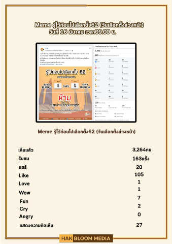 Meme รูไวกอนไปเลือกตั้ง62 (วันเลือกตั้งลวงหนา) วันที่ 16 มีนาคม เวลา09.00 น. Meme รูไวกอนไปเลือกตั้ง62 (วันเลือกตั้งลวงหนา) 3,264คน 163ครั้ง 20 105 1 1 7 2 0 27