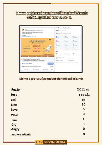 Meme สรุปจำนวนผูลงทะเบียนขอใชสิทธิเลือกตั้งลวงหนา วันที่ 21 กุมภาพันธ เวลา 17.57 น. Meme สรุปจำนวนผูลงทะเบียนขอใ้สิทธะเลือกตั้งลวงหนา 2,011 คน 111 ครั้ง 16 90 5 0 1 0 0 0