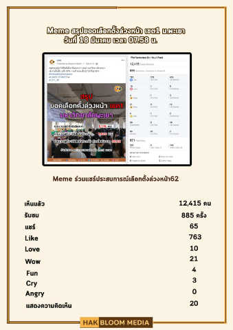 Meme สรุปยอดเลือกตั้งลวงหนา เขต1 ม.พะเยา วันที่ 18 มีนาคม เวลา 07.58 น. Meme รวมแชรประสบการณเลือกตั้งลวงหนา62 12,415 คน 885 ครั้ง 65 763 10 21 4 3 0 20