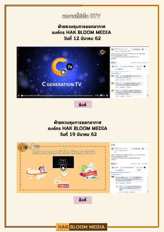 ผลงานที่ทำใน CTV ฝายควบคุมการออกอากาศ องคกร HAK BLOOM MEDIA วันที่ 12 มีนาคม 62 ลิงค ฝายควบคุมการออกอากาศ องคกร HAK BLOOM MEDIA วันที่ 19 มีนาคม 62 ลิงค