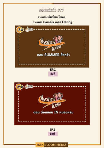 ผลงานที่ทำใน CTV รายการ เที่ยวไหน ไปเลย ตำแหนง Camera man Editing EP.1 ลิงค EP.2 ลิงค