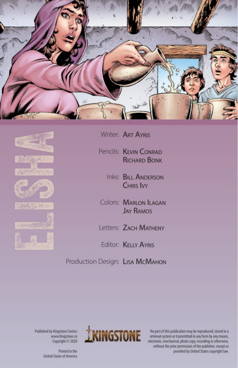 ELISHA Writer: ART AYRIS Pencils: KEVIN CONRAD RICHARD BONK Inks: BILL ANDERSON CHRIS IVY Colors: MARLON ILAGAN JAY RAMOS Letters: ZACH MATHENY Editor: KELLY AYRIS Production Design: LISA MCMAHON ©