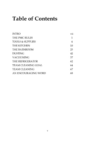 Table of Contents INTRO vii THE PMC RULES 1 TOOLS & SUPPLIES 4 THE KITCHEN 10 THE BATHROOM 25 DUSTING 42 VACUUMING 57 THE REFRIGERATOR 62 TEAM CLEANING GOAL 64 TEAM CLEANING 67 AN ENCOURAGING WORD 68 v