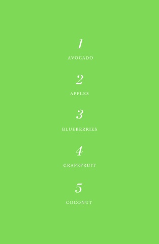 1 AVOCADO 2 APPLES 3 BLUEBERRIES 4 GRAPEFRUIT 5 COCONUT