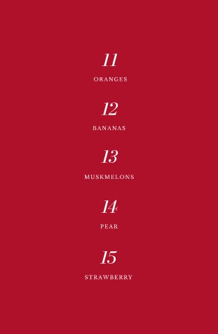 11 ORANGES 12 BANANAS 13 MUSKMELONS 14 PEAR 15 STRAWBERRY