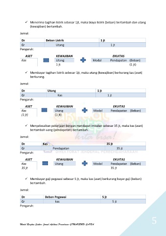 Membayar gaji pegawai sebesar 5 jt, maka kas (aset) berkurang bayar gaji (beban)