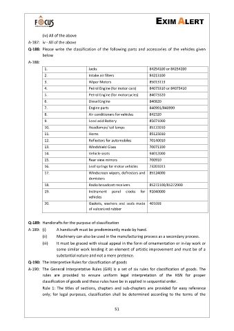 Q-188: Please write the classification of the following parts and accessories of the vehicles given