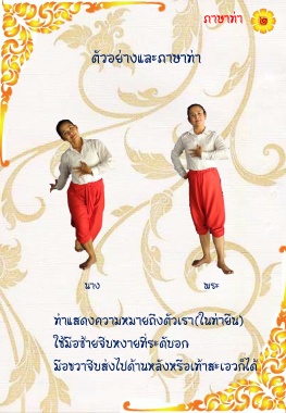 ภำษำท่ำ ๒ ตัวอย่ำงและภำษำท่ำ นำง พระ ท่ำแสดงควำมหมำยถึงตัวเรำ(ในท่ำยืน) ใช้มือซ้ำยจีบหงำยที่ระดับอก มือขวำจีบส่งไปด้ำนหลังหรือเท้ำสะเอวก็ได้