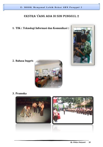E - B O O K M e n g e n a l L e b i h D e k a t S D N P u n g g u l 2 EKSTRA YANG ADA DI SDN PUNGGUL 2 1. TIK ( Teknologi Informasi dan Komunikasi ) 2. Bahasa Inggris 3. Pramuka By. Wahyu Hariyanti - 10