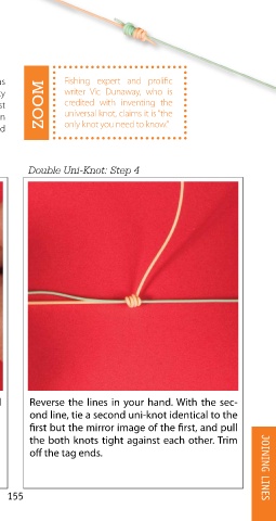 Tighten this first uni-knot against the second Reverse the lines in your hand. With the sec-