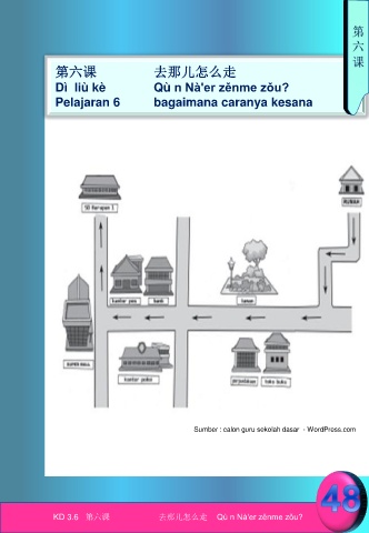 第六课 去那儿怎么走 Dì liù kè Qù n Nà'er zěnme zǒu? Pelajaran 6 bagaimana caranya kesana Sumber : calon guru sekolah dasar - WordPress.com KD 3.6 第六课 去那儿怎么走 Qù n Nà'er zěnme zǒu?