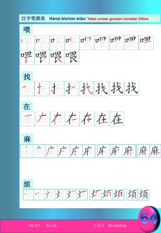 汉字笔顺表 Hànzì bǐshùn biǎo/ Tabel urutan guratan karakter China 喂 找 在 麻 烦 KD 4.7 第七课 打电话 Dǎ diànhuà