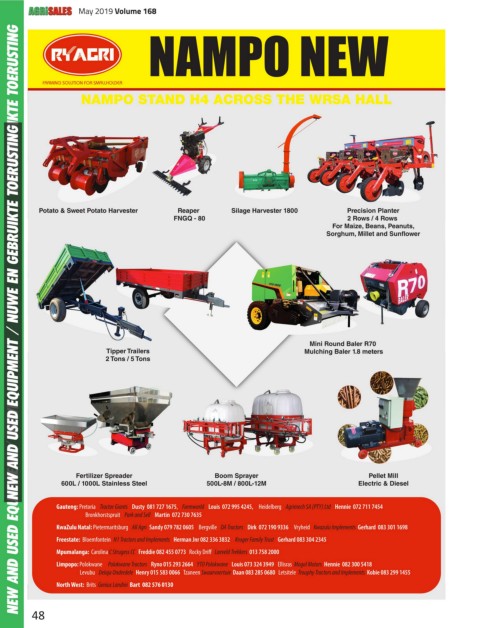 KwaZulu Natal: Pietermaritsburg All Agri Sandy 079 782 0605 Bergville DA Tractors Dirk 072 190 9336 Vryheid Kwazulu Implements Gerhard 083 301 1698