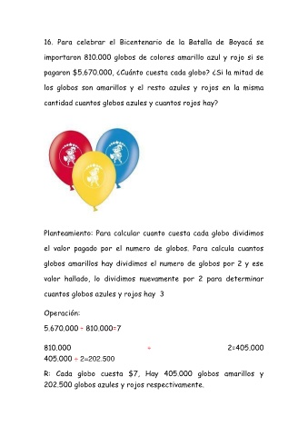 Planteamiento: Para calcular cuanto cuesta cada globo dividimos