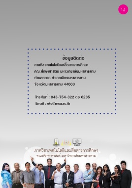 14 ข้อมูลติดต่อ ภ�ควิช�เทคโนโลยีและสื่อส�รก�รศึกษ� คณะศึกษ�ศ�สตร์ มห�วิทย�ลัยมห�ส�รค�ม ตำ�บลตล�ด อำ�เภอเมืองมห�ส�รค�ม จังหวัดมห�ส�รค�ม 44000 โทรศัพท์ : 043-754-322 ต่อ 6235 Email : etc@msu.ac.th