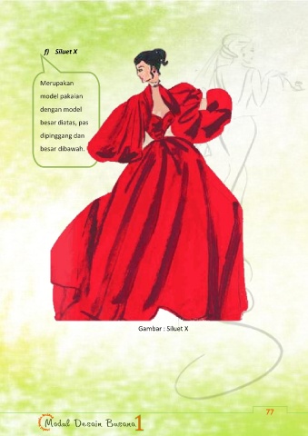 f) Siluet X Merupakan model pakaian dengan model besar diatas, pas dipinggang dan besar dibawah. Gambar : Siluet X 77