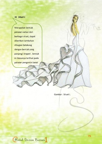 h) Siluet L Merupakan bentuk pakaian variasi dari berbagai siluet, dapat diberikan tambahan dibagian belakang dengan bentuk yang panjang/ draperi . bentuk ini biasanya terlihat pada pakaian pengantin barat Gambar : Siluet L Gambar : Siluet L 79