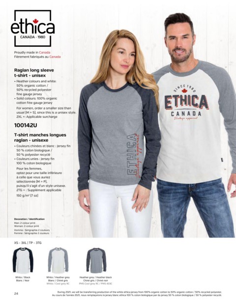 24 During 2021, we will be transferring production of the white ethica jersey from 100% organic cotton to 50% organic cotton / 50% recycled polyester . Slight colour variations in dye lots may occur . | See the price list for garment and decoration costs . www.attraction.com 25