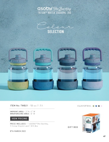 Colour SELECTION ITEM No: TWB21 - 50 oz / 1.5 l COLOUR OPTIONS : IMPRINT AREA - 3”H x 3” W WRAPAROUND AREA - 8” W VIEW PRICING PRICE INCLUDES - 1 ASOBU The Barkley, ® 1 Colour Imprint and 1 Gift Box GIFT BOX ETA MARCH 2022 47
