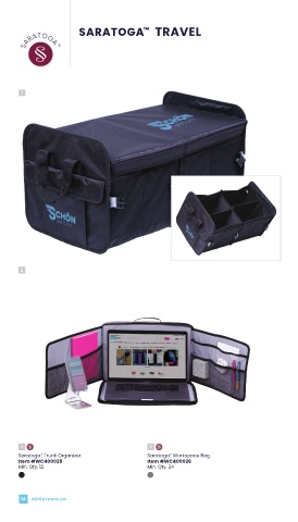 ™ SARATOGA TRAVEL COLLECTION SARATOGA ™ 1 2 1 2 Saratoga ™ Trunk Organizer Saratoga ™ Workspace Bag Item #WC400025 Item #WC400026 Min. Qty. 12 Min. Qty. 24 14 ADGpromo.ca Go Online for Product Details