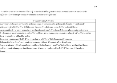 รายการพฤติกรรม 1. จัดสภาพแวดลอมภายในหองเรียน และภายนอกหองเรียนที่เอื้อตอการเรียนรู 2. สงเสริมการมีปฏิสัมพันธที่ดีระหวางครูกับผูเรียน และผูเรียนกับผูเรียน 3. ตรวจสอบสิ่งอํานวยความสะดวกในหองเรียนใหพรอมใชและปลอดภัยอยูเสมอ 1. จัดทําขอมูลสารสนเทศของนักเรียนเปนรายบุคคลและเอกสารประจําชั้นเรียนอยา