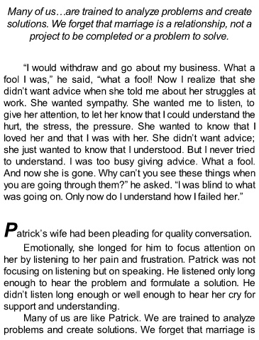 Patrick’s wife had been pleading for quality conversation.