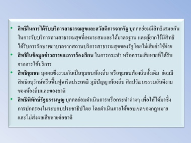 • สิทธิในการได้รับบริการสาธารณสุขและสวัสดิการจากรัฐ บุคคลย่อมมีสิทธิเสมอกัน