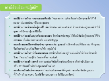 • การมีส่วนร่วมช่วยเหลือผู้ยากไร้ เช่น ช่วยอ านวยความสะดวก ร่วมผลักดันกฎหมายที่ท าให้