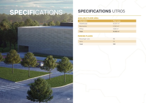 SPECIFICATIONS SPECIFICATIONS UTR05 AVAILABLE FLOOR AREA Discription Floor area Warehouse 12.207 m 2 Mezzanine 2.290 m 2 Office 1.686 m² Total 16.183 m² PARKING PLACES Passenger cars 115 Vans 74 Total 189 07
