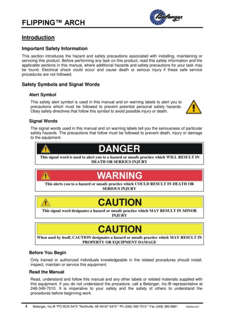 4 Belanger, Inc.® *PO BOX 5470 *Northville, MI 48167-5470 * Ph (248) 349-7010 * Fax (248) 380-9681 1MANUL027