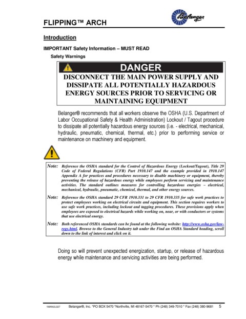 1MANUL027 Belanger®, Inc. *PO BOX 5470 *Northville, MI 48167-5470 * Ph (248) 349-7010 * Fax (248) 380-9681 5