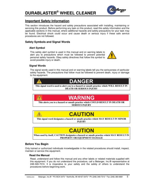 1MANUL054 Belanger, Inc.® * PO BOX 5470 * Northville, MI 48167-5470 * Ph (248) 349-7010 * Fax (248) 380-9681 5