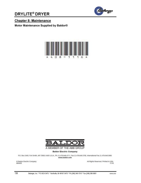 ® DRYLITE DRYER Chapter 8: Maintenance Motor Maintenance Supplied by Baldor® 136 Belanger, Inc. * PO BOX 5470. * Northville, MI 48167-5470 * Ph (248) 349-7010 * Fax (248) 380-9681 1MANUL960