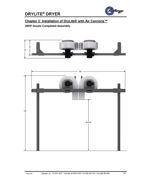 ® DRYLITE DRYER Chapter 3: Installation of DryLite® with Air Cannons™ 20HP Nozzle Completed Assembly 27” 32” 164” 132” 89-3/16” 1MANUL960 Belanger, Inc. * PO BOX 5470. * Northville, MI 48167-5470 * Ph (248) 349-7010 * Fax (248) 380-9681 23