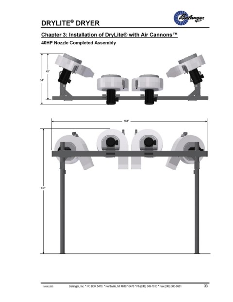 ® DRYLITE DRYER Chapter 3: Installation of DryLite® with Air Cannons™ 40HP Nozzle Completed Assembly 49” 54” 164” 132” 1MANUL960 Belanger, Inc. * PO BOX 5470. * Northville, MI 48167-5470 * Ph (248) 349-7010 * Fax (248) 380-9681 33