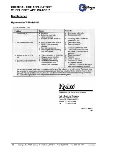 CHEMICAL TIRE APPLICATOR™ WHEEL BRITE APPLICATOR™ Maintenance Hydrominder™ Model 506 22 Belanger , Inc. * 1001 Doheny Ct. * Northville, MI 48167 * Ph (248) 349-7010 * Fax (248) 380-9681 1MANUL088