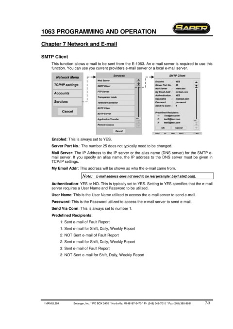 This function allows e-mail to be sent from the E-1063. An e-mail server is required to use this