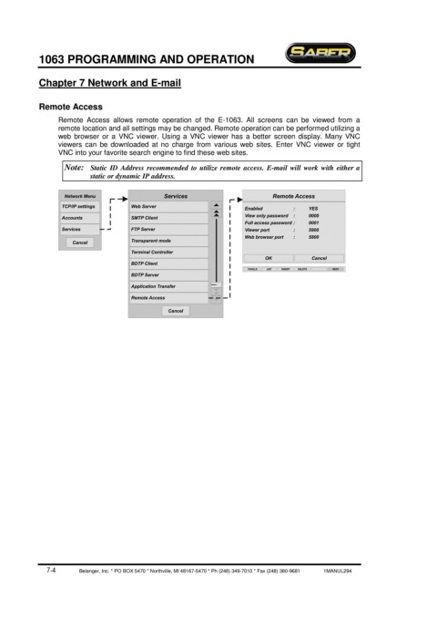 Remote Access allows remote operation of the E-1063. All screens can be viewed from a