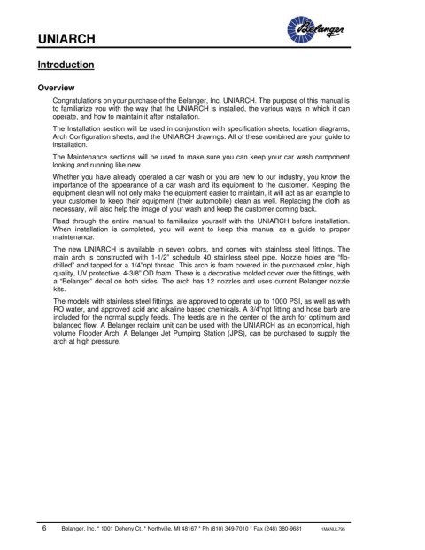 Congratulations on your purchase of the Belanger, Inc. UNIARCH. The purpose of this manual is