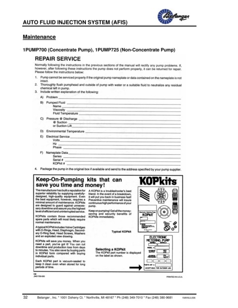 AUTO FLUID INJECTION SYSTEM (AFIS) Maintenance 1PUMP700 (Concentrate Pump), 1PUMP725 (Non-Concentrate Pump) 32 Belanger , Inc. * 1001 Doheny Ct. * Northville, MI 48167 * Ph (248) 349-7010 * Fax (248) 380-9681 1MANUL006