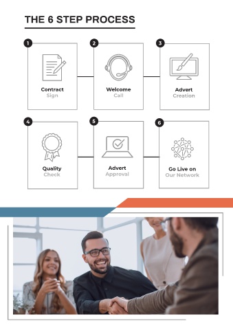 THE 6 STEP PROCESS 1 2 3 Contract Welcome Advert Sign Call Creation 4 5 6 Quality Advert Go Live on Check Approval Our Network