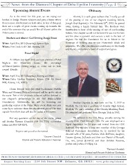 Upcoming Alumni Events Obituary As is the trend for this year, we are trying our Alumni, it is with great sadness that I notify you all hardest to bridge Alumni relations and pave a future where of the passing of one of our chapters founding fathers, there is more involvement on both sides. In lieu of this goal, Joseph Roy Depriest Jr. On February 22 , 2012, he passed nd there are a couple of great events coming up towards the away, leaving a legacy behind him. The Brothers were end of the semester that we would like all Alumni within the heartbroken to hear of the passing of one of our founding Atlanta area to attend. fathers. Our chapter would not be here if it was not for him and his drive to commit and execute a task to the best of Brothers and Alumni Golf Driving Range Event degrees. He laid the foundation for us to follow in his When: April 21st, 2012 (Saturday). 2pm to 5pm footsteps of holding true to our Fraternity's ideals and Where: Fox Creek Golf Club. Smyrna, GA principles. We offer our sincerest condolences to his family and friends, and extend a hand of support and grace. Poker Night! At 630pm (on April 21st) we have planned a Poker Night at the Fraternity house. We encourage all Alumni (within driving range) to come out to both events! Details: When: April 21st, 2012 (Saturday), Starting at 630pm Where: Delta Upsilon Fraternity House (154 5th Street NW, Atlanta, GA, 30313) Home brewed beer (provided by Alumnus Freddie Weiss and Alumnus Nelson Lourenco) will be up for sale at the event. Part of the proceeds collected will be donated to our chapter’s philanthropy in the Fall (Make-a-Wish Foundation). Additionally, we will be honoring our Brother Depriest Jr. was born on Oct. 7, 1937 in graduating seniors at the Poker Night event. Make sure you Norfolk, Va. He was a graduate of Granby High School, come by to welcome them into the Alumni group! The time Norfolk, Va. and a member of the Granby Marching Band. capsule from their class will also be sealed at this event. He attended and graduated from Georgia Tech in 1962. For any questions on the day of the event, please He enlisted in the U.S. Navy, proudly serving his call Brother Tanveer Chandok (404 731 7776) or Brother country from 1962 through 1966. He was employed as a Ethan Lai (865 924 8267). Signal Supervisor for 34 years and retired from the CSX Railroad. Roy was also a long time member of the Georgia Hope to see you all at the events! Railroad Passengers Association. He is survived by his devoted wife of 50 years, Patricia Trish DePriest, daughter, Tanveer Chandok Lisanne (James, Jr.)Leeds and their son Daniel of Roswell, Alumni and Parents Relations Chairman Ga., son, Jamey (Jennifer) and their children Savanna, Jordan and Joshua of Ellijay, Ga. Tanveer Chandok Alumni and Parents Relations Chairman