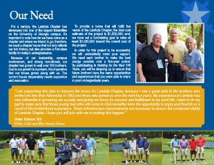 Our Need For a century, the Lambda Chapter has To provide a home that will fulfll the developed into one of the largest fraternities needs of the Lambda Chapter, the total cost on the University of Georgia campus. It’s estimate of the project is $1,500,000; and, important to note how far we have come as a we have set a fundraising goal to raise at chapter and where we intend to go; therefore, least $1,000,000 toward the overall cost of we need a chapter house that not only refects the project. our rich history, but also provides a frst-class In order for this project to be successful, facility for today’s undergraduates. we will undoubtedly need your support. Because of our leadership, campus We need each brother to make the best involvement, and strong recruitment, our pledge possible over a fve-year period. chapter has grown to well over 100 brothers. By participating in Building for the Next 100 Due to our growth in numbers, it is imperative Years, you will be stepping up to ensure that that our house grows along with us. The future brothers have the same opportunities current house desperately needs expansion and experiences that you were able to share and renovation. in your undergraduate years. “I am supporting this plan to improve the house for Lambda Chapter, because I owe a great debt to the brothers who invited me into their fellowship in 1962 and those who joined us over the next four years. My experience at Lambda was very infuential in grooming me socially and giving me focus for success and fulfllment in my adult life. I want to do my part to make sure that those young men who will come to UGA hereafter have the opportunity to enjoy and fourish as a result of the brotherhood experience. These infrastructure improvements are necessary to ensure the continued vitality of Lambda Chapter. I hope you will join with me in making this happen.” John Tolson ’63 White, Gold, and Blue Society Donor